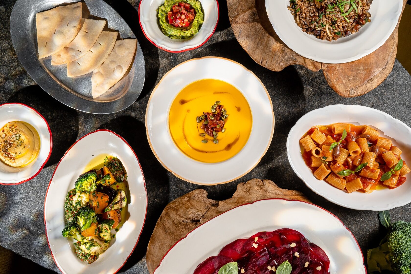 В закусках гостей ждут карпаччо из свеклы с песто и бальзамическим уксусом, украшенное кедровыми орехами, безглютеновая хрустящая фокачча с хумусом и гуакамоле, а также овощи на гриле с песто и чимичурри. На горячее подают тыквенный суп с семенами тыквы и вялеными томатами, гречку с белыми грибами, вешенками и зеленью и пасту ригатони с томатами и каперсами.
