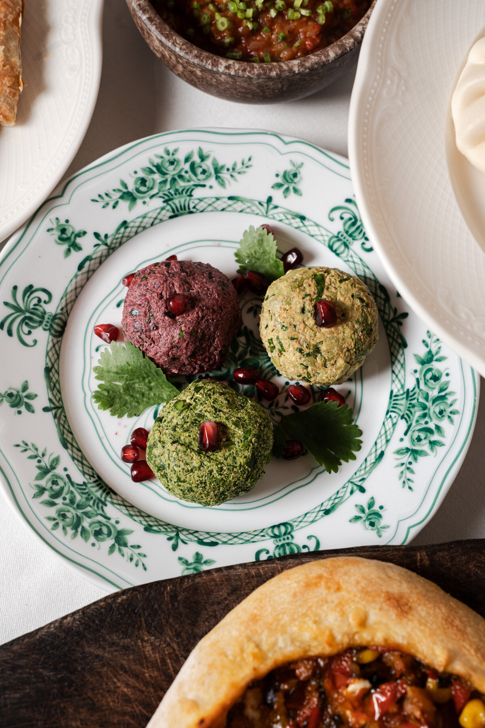 Маршрут открывают хумус с томатами и мухаммара с грецким орехом. Далее — зеленый салат, овощной салат и запеченные овощи с акцентом на свежесть, сезонность и чистоту сочетаний.