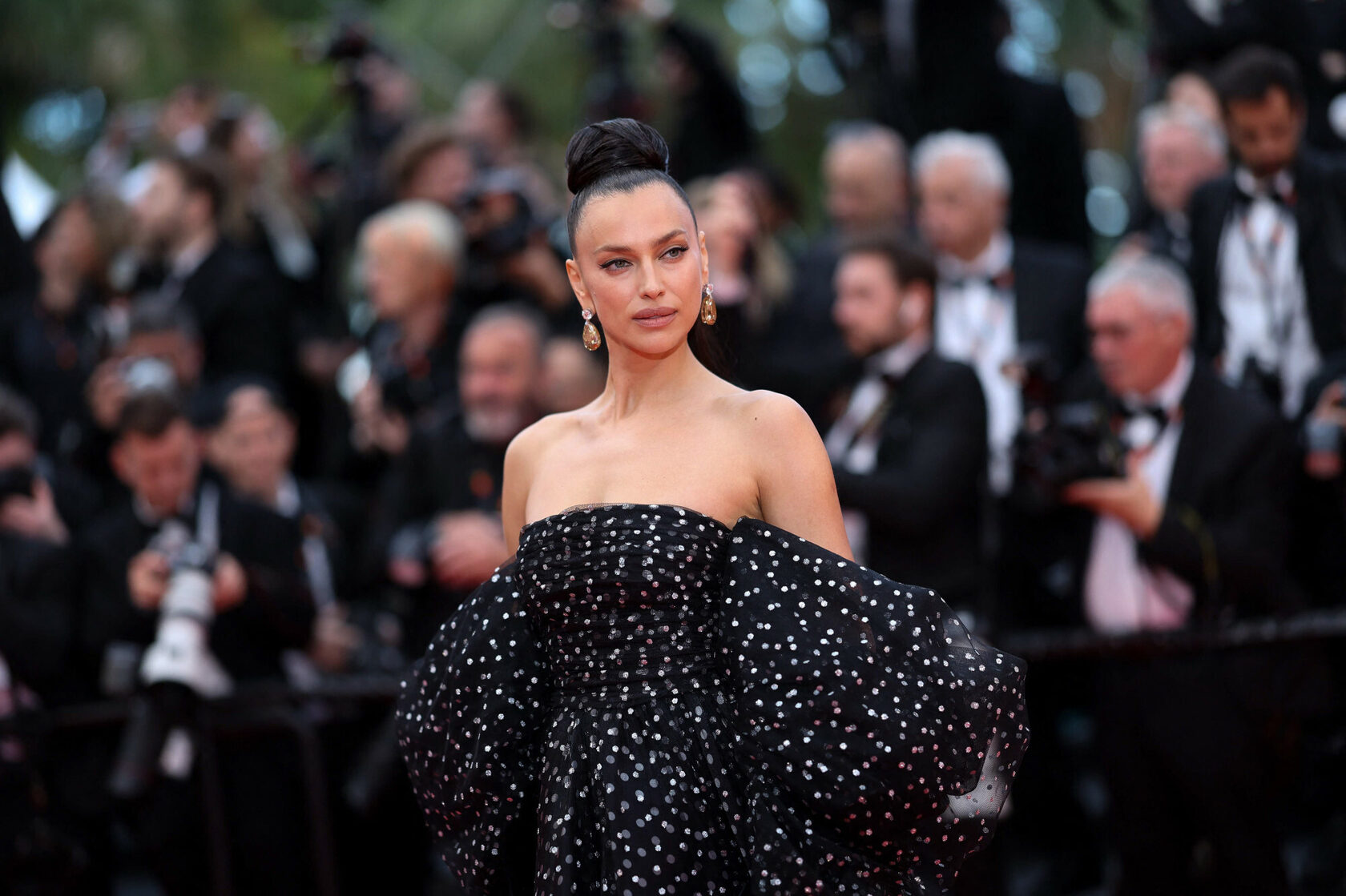 Русская икона моделинга Ирина Шейк одна из первых продефилировала по красной дорожке церемонии открытия Каннского кинофестиваля. Знаменитость выбрала пышное черно-белое платье с мелким принтом и открытыми плечами от Armani Privé. Ирина дополнила свой эффектный образ массивными серьгами с бриллиантами и черными перчатками. Поклонники сравнили силуэт наряда модели с платьем принцессы.