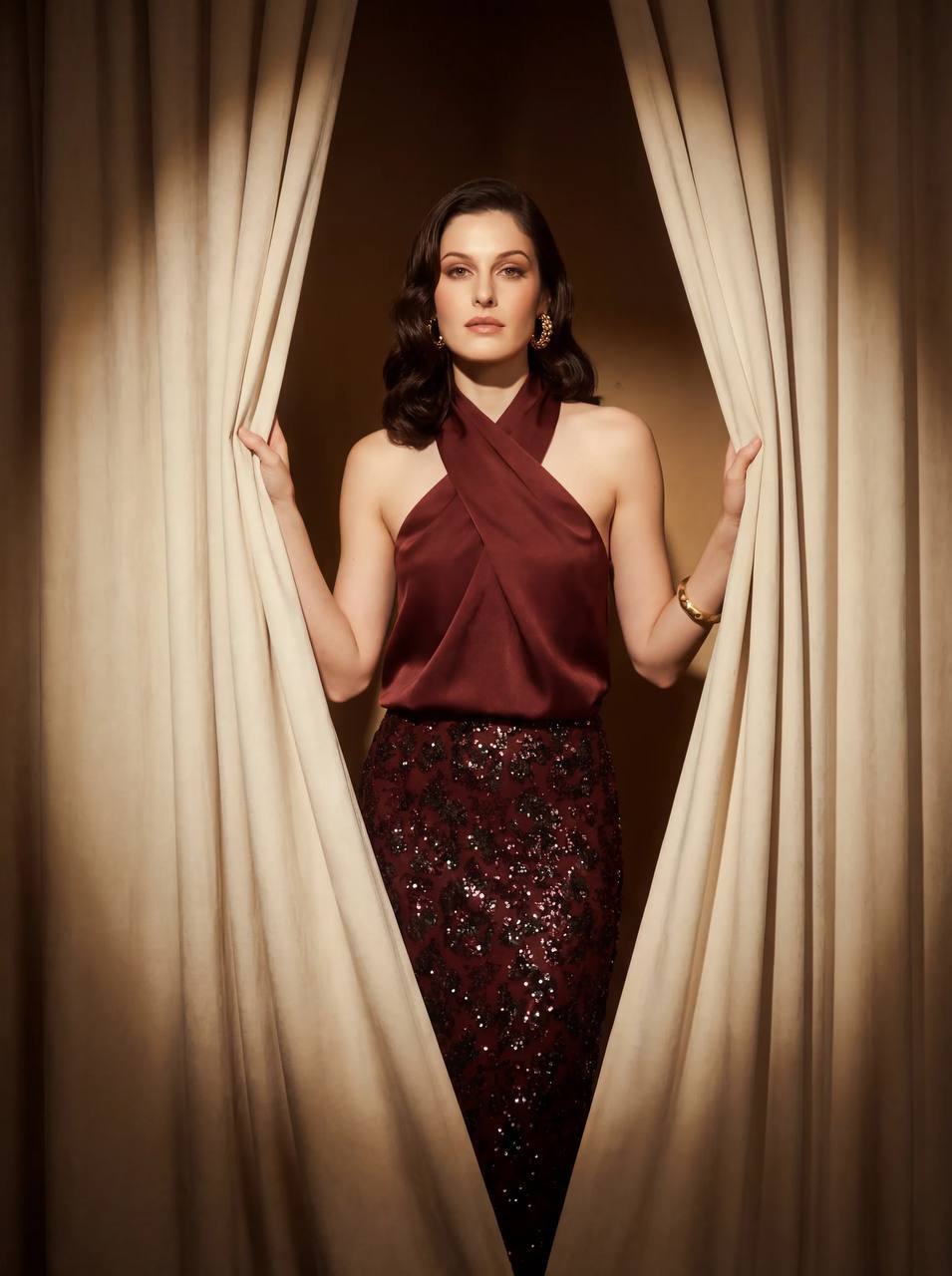 Сияния ткани топа DEBRA и пайеток юбки BLAIR не спорят, а играют в унисон. Загадочное сплетение верха подчеркивает женственный силуэт и мягкую диагональ — будто две ноты встретились в аккорде. Контрастный узор из пайеток как сложная музыкальная партитура, где цвет, форма и блеск взаимодействуют по строгим законам композиции.