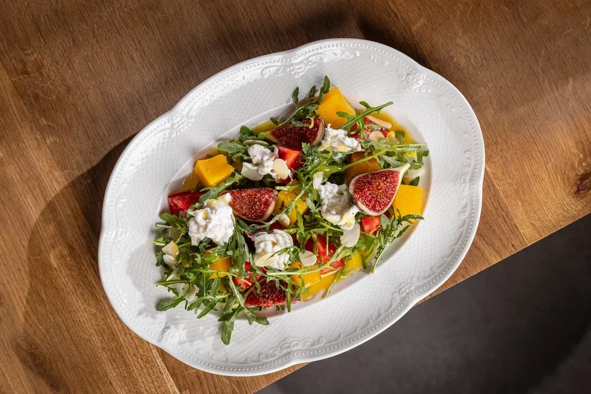Раздел антипасти открывают морепродукты. Тунец татаки подают со стружкой трюфеля — блюдо с чистым вкусом рыбы и деликатным ароматом гриба. Салат с лососем и запеченной тыквой сочетает мягкость рыбы, сладость печеных ингредиентов и тонкий акцент трюфеля.