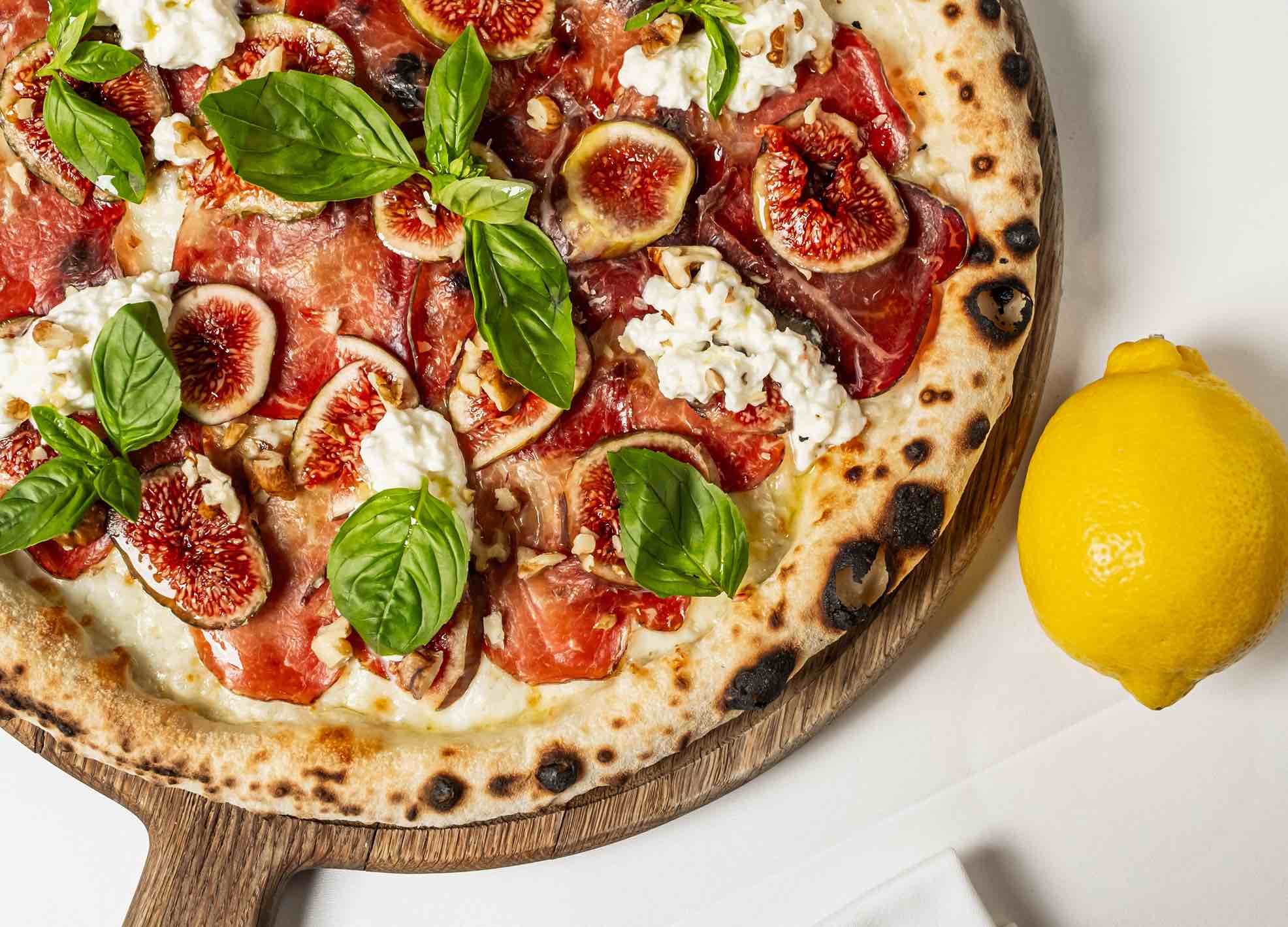 В дровяной печи выпекаются две пиццы: с тыквой, горгонзолой и хамоном — с мягким вкусом печёных ингредиентов и пикантностью сыра, и с брезаолой, инжиром и страккино — со сливочной основой и лёгкой сладостью фрукта.