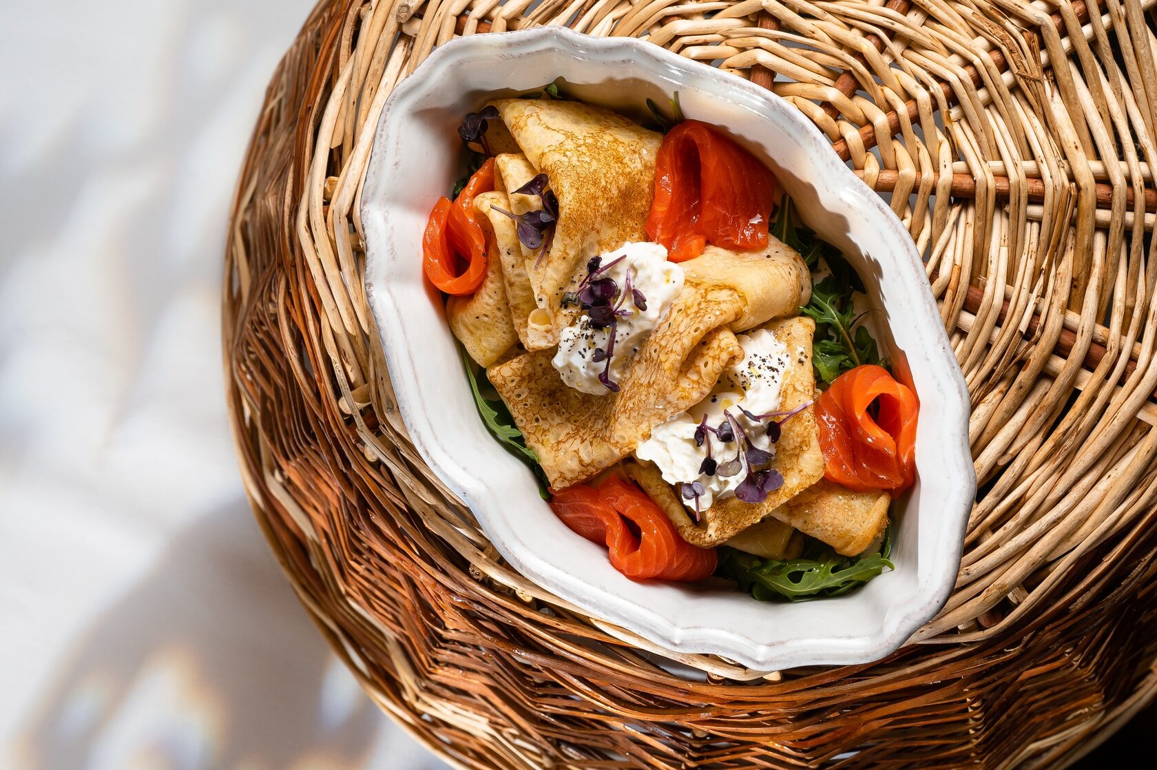 Ресторан №13 выбирает более камерный, но не менее выразительный подход. Воздушные блины-конверты на молоке «Петмол» подаются с вишневым конфи и сливочным кремом, дополненные шоколадом и хрустящим крамблом. В сытных вариантах — пастрами с сулугуни и пармезаном, лосось с креметтой, авокадо и свежим огурцом. Попробовать масленичное меню можно с 16 по 22 февраля