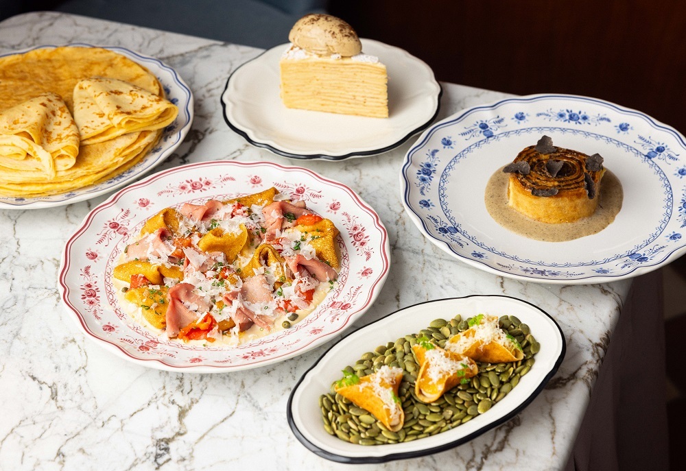 В Greeks & Pasta масленичная неделя раскрывается через средиземноморские и европейские акценты. Ажурные блины подают с говяжьим фаршем и соусом тоннато на основе тунца, каперсов и анчоусов, со шпинатом и тремя видами сыров, а также с пастрами и дзадзики. В десертной части меню — ягодные конверты со сливочным кремом «Петмол» и ванильным мороженым и блинный торт тирамису. В нем классическая русская традиция встречается с итальянским темпераментом.