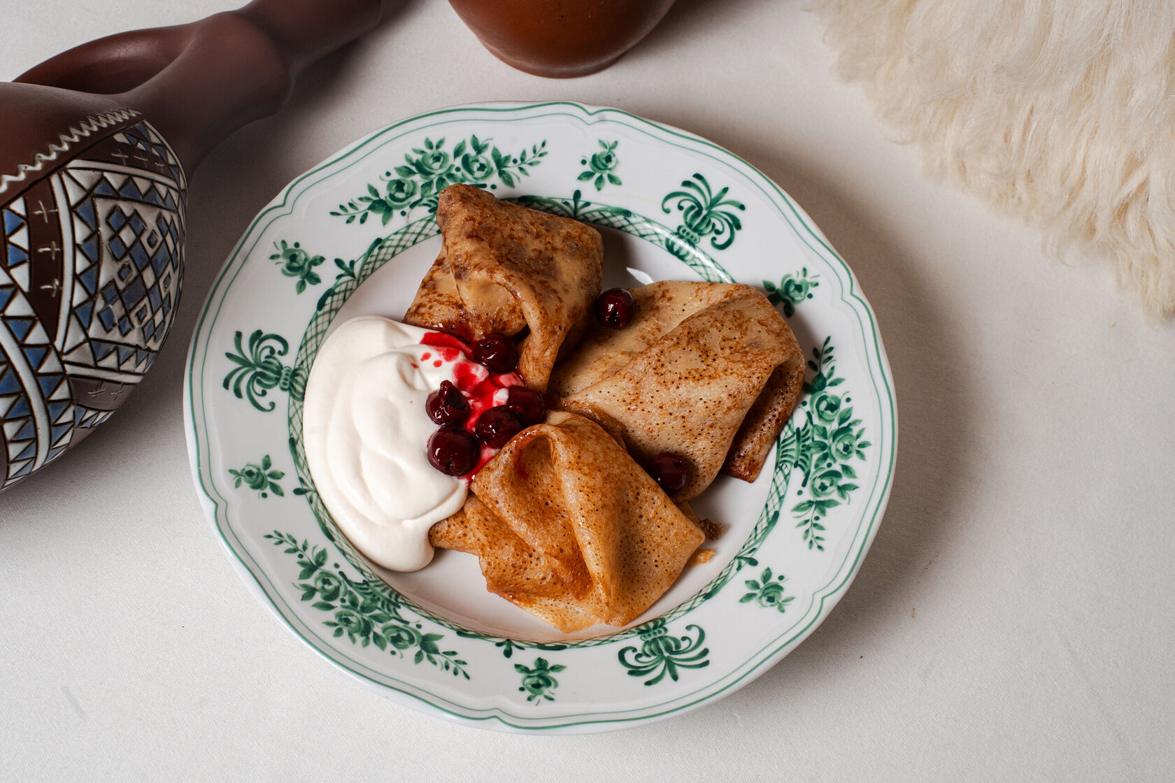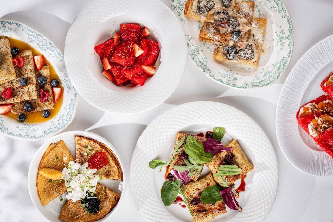 В меню ресторана появились специальные новинки: мясные блины, блины с грибами, блины с лососем, блинчики «Креп Сюзетт» с ванильным мороженым, шоколадный блинный торт с пряной вишней, запеченный блин с творогом и клюквой.