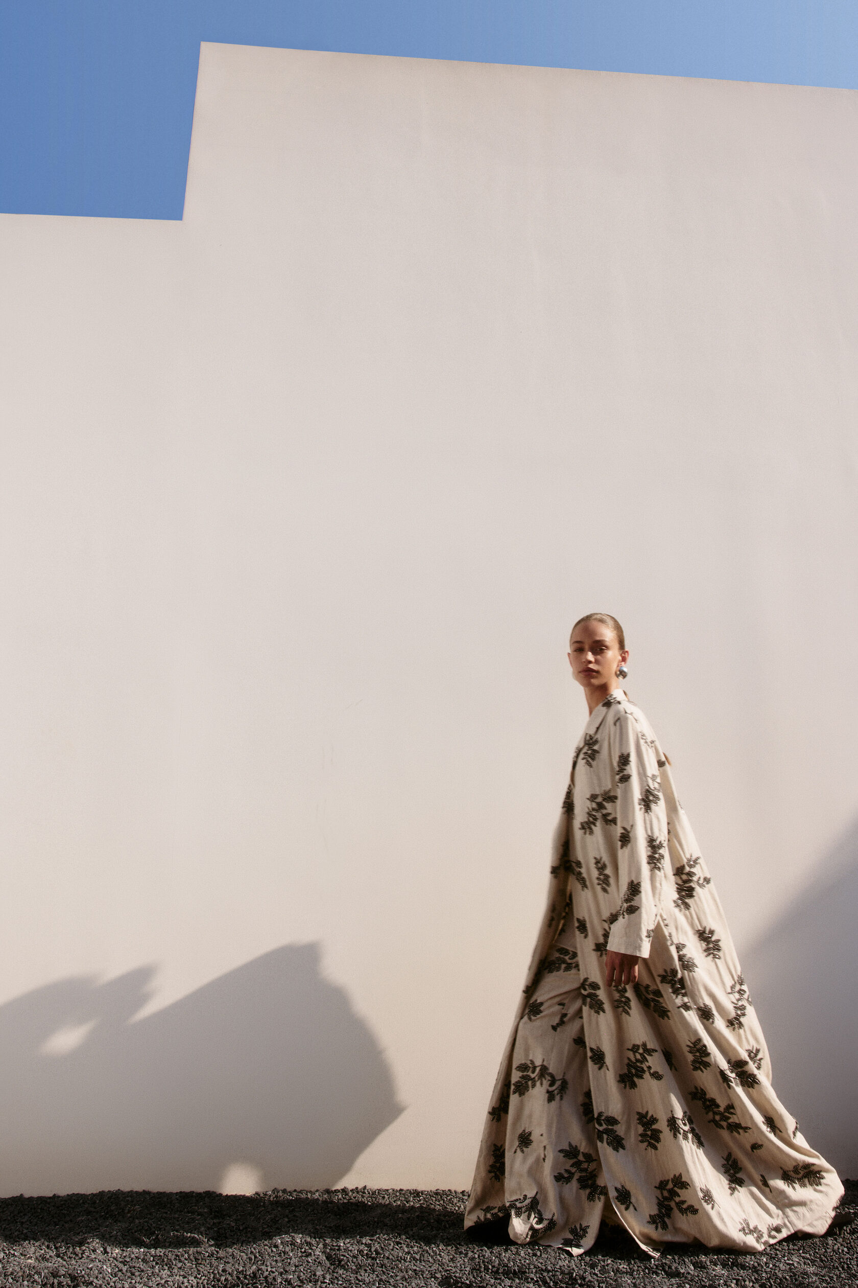 Также в числе ключевых позиций — несколько моделей пальто. Однотонное — из атласа, с цветочным узором — из перламутрового жаккарда, с вышивкой — из смесового льна.