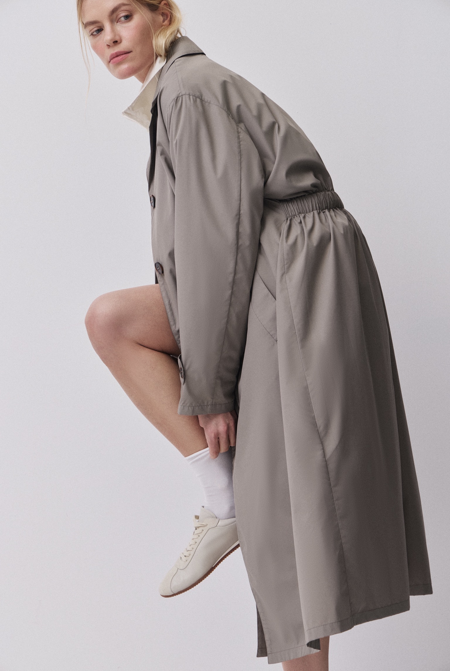 В центре истории — модели из тонкой плащевой ткани с водоотталкивающей пропиткой. Сегодня такие материалы становятся частью повседневного гардероба, отвечая на запрос на мобильность и функциональность.